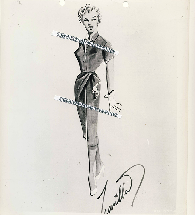 In June 2016, Profiles (now Heritage) Auctions #83 sold a Travilla sketch from Gentlemen Prefer Blondes of Marilyn Monroe “Depicting an evening gown of aubergine steel gray couched in meandering hyphen pattern braid.”
